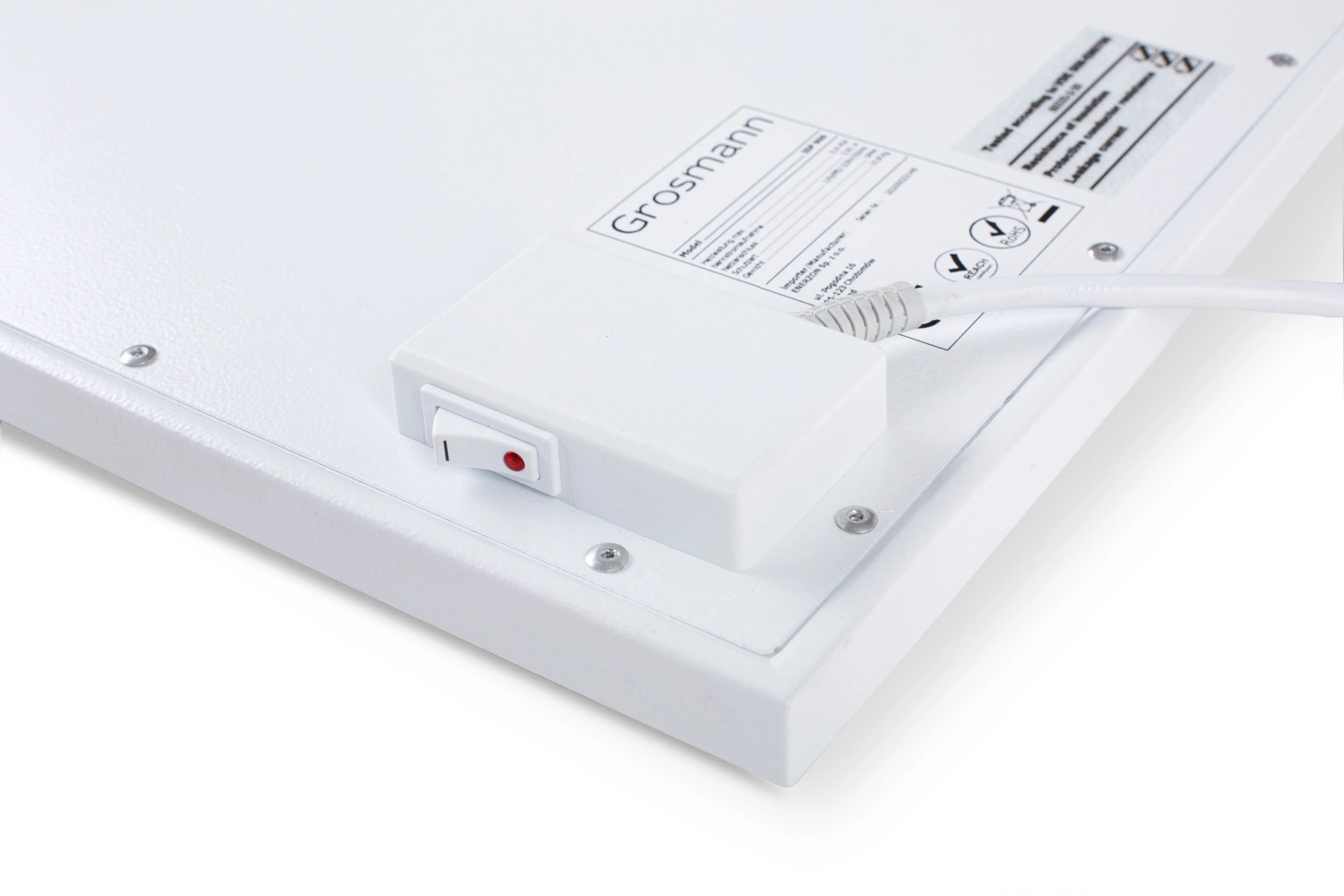 Panel na podczerwień Grosmann Infra dostarczany jest z przymocowanym, opatentowanym, wygodnym w montażu wspornikiem. Umożliwia on montaż panelu grzewczego na ścianie lub na suficie, w pionie lub poziomie. W przypadku montażu do sufitu (w przypadku modeli większych gabarytowo), montaż urządzeń powinien być wykonywany przez 2 dorosłe osoby lub firmę instalatorską. Grzejniki są dostarczane w stanie gotowym do instalacji z wtyczkami i mogą być podłączone do gniazdka lub bezpośrednio do sieci. W przypadku wykonywania podłączenia na stałe do instalacji konieczne jest wezwanie elektryka.