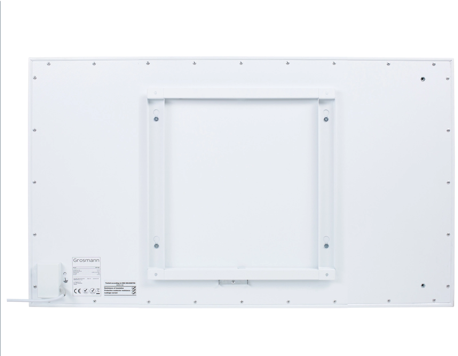 Panel na podczerwień Grosmann Infra dostarczany jest z przymocowanym, opatentowanym, wygodnym w montażu wspornikiem. Umożliwia on montaż panelu grzewczego na ścianie lub na suficie, w pionie lub poziomie. W przypadku montażu do sufitu (w przypadku modeli większych gabarytowo), montaż urządzeń powinien być wykonywany przez 2 dorosłe osoby lub firmę instalatorską. Grzejniki są dostarczane w stanie gotowym do instalacji z wtyczkami i mogą być podłączone do gniazdka lub bezpośrednio do sieci. W przypadku wykonywania podłączenia na stałe do instalacji konieczne jest wezwanie elektryka.
