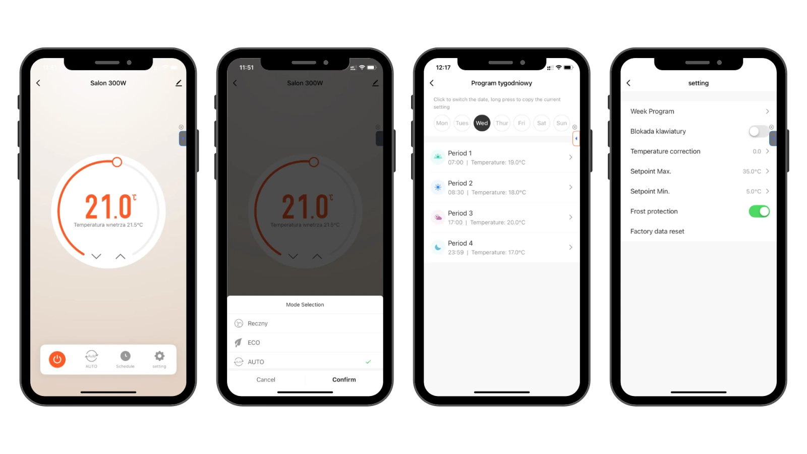 Zdalna kontrola przez Wi-Fi: Zarządzaj temperaturą w swoim domu z dowolnego miejsca za pomocą aplikacji Tuya. Sterowanie przez smartfon zapewnia pełną kontrolę i wygodę.